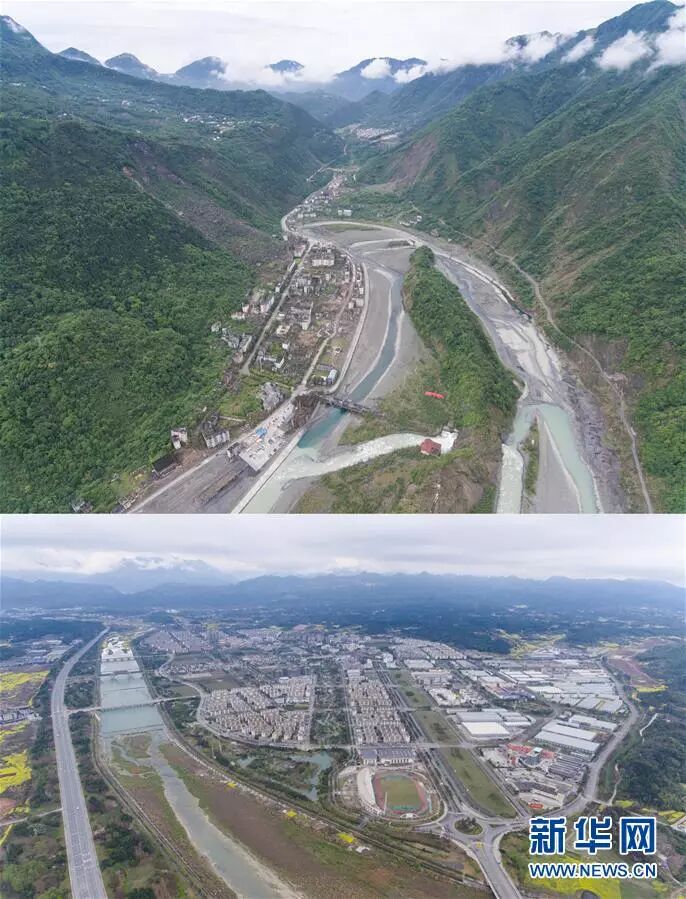 拼版照片上图:俯瞰北川老县城地震遗址(2018年5月11日无人机拍摄);下图:俯瞰北川新县城全景(2018年3月17日无人机拍摄)